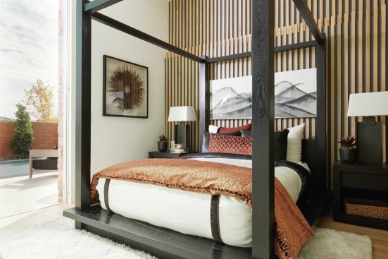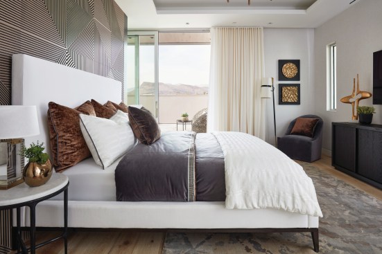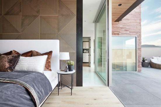 On the bedroom side, the wall was outfitted with a bamboo-panel series that uses isosceles triangles to create squares and nested geometric shapes. “We wanted to utilize a unique material that would make a statement,” says Ryan Young Interiors’ Tara Ryan. “It’s still a very clean design, but it’s textural and rich.”