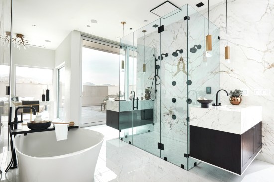 A book-matched porcelain slab was used on the opposite side of the wall in the master bathroom, where the glass-enclosed shower was placed. His-and-her vanities float on either side of the shower, while the freestanding tub—and mirroring book-matched slab—sits adjacent to the sinks and shower to complete the wet area.