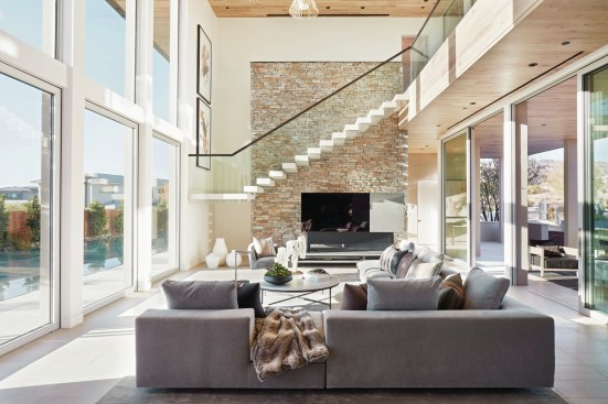 From the entryway, the floating wood stair with glass railings wraps around the focal fireplace to the double-height living room. Seamless indoor-outdoor connections were stressed again here, with expansive window walls on the room’s two main sides. On one side, swinging doors open to the pool, while the other includes large sliders to extend the living area toward the front.