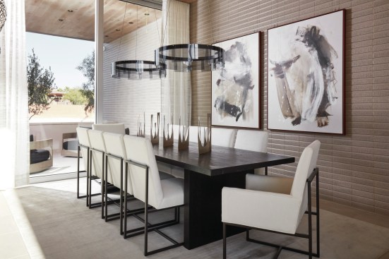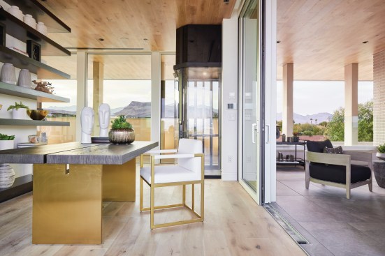 Although staged as an office with floating bookshelves, the area—surrounded by exterior balconies—can be used for second-story entertaining, according to the interior design team. A built-in with large cabinet doors conceals a small wet bar. “They saw this as a huge entertainment area,” states Tara Ryan. “People can be downstairs in one of the many outdoor areas and also upstairs because of the incredible views of Las Vegas and the mountains.”