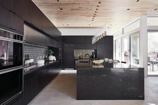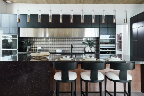 In the kitchen, the design team chose a darker color palette with contemporary flair. A wall of flat-door cabinets in an onyx finish, waterfall edging on the spacious island, and a rectangular mosaic backsplash give the space its clean and simplistic lines—a key factor in eastern design, according to interior designer Tara Ryan.