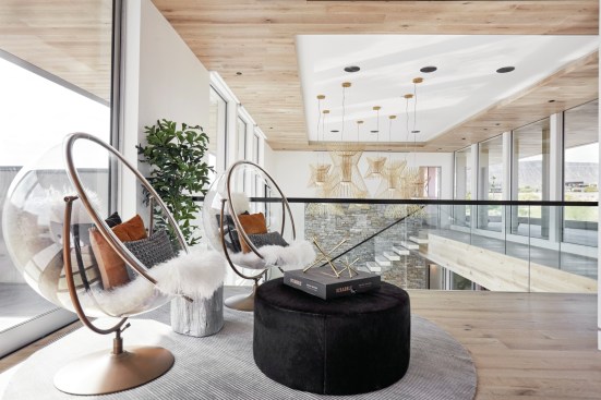 The secondary, smaller flex space overlooks the double-height living room in the central part of the home. With the see-through glass railings continuing to the second story, owners have a clear sightline from the living room to the landing. The designers chose to create a simple seating area with two clear acrylic bubble chairs in order to not obstruct the views from the neighboring balcony.