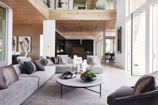Natural materials, clean lines, and a sense of calmness were also instilled into the great room. The white oak wood ceilings were continued, and the interior design company selected a series of coordinating, statement light fixtures. “This is a home that is meant to be very light and airy,” says Tara Ryan, president at Ryan Young Interiors. “We didn’t want anything taking away from the wood or the view out of the expansive glass.”