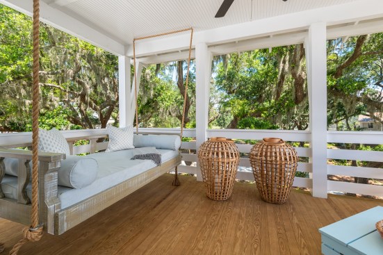 Upstairs, the master suite sits toward the front of the home—with its own exterior porch that includes a hanging day bed for morning or night lounging—and the master bath is outfitted with dual vanities, a drop-in tub, a tiled shower, and a walk-in closet. The third bedroom suite and a hall linen closet make up the rest of the second level.