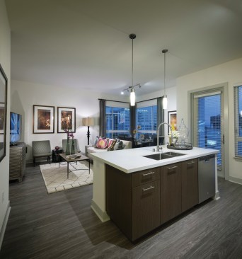 Designed in collaboration with local firm TCA Architects, the solar-powered units feature a slightly different aesthetic than the standard plans, and cost more to rent. Flooring, cabinets, backsplashes, and baths feature sustainable materials and finishes in earth-toned hues, and the apartments are fitted with recycled-glass countertops and reclaimed hardwood flooring throughout.