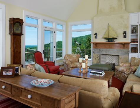 The house’s orientation and the long drive on the approach keep the stunning scenery out of sight until guests step into the foyer. Vanze wanted to re-create that “wow” moment he experienced on his first visit when he stepped out of the car and turned around to see the valley unfold below. “The whole outdoor vista becomes one wall of the house,” he says, “and that wall is as glassy as we could make it and still keep within the vernacular.”