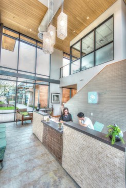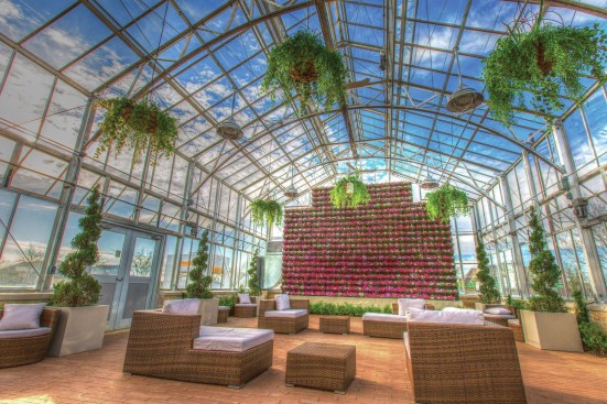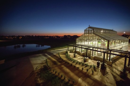 The complex of six structures is made up of a 3,000-square-foot welcome center, a two-story fitness center, a yoga studio with on-demand instructional videos, a café, and a treehouse with observation deck and fireplace. The most unique building on the property is the glass-enclosed greenhouse conservatory that is open to residents and used for community gatherings.