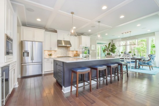 The kitchen includes a large command-center island that can serve as an informal gathering space for small or large groups. A “bumped out” dining nook next to the kitchen provides design flexibility. “It adds a lot more exterior wall that opens onto the living area, which allows you to add a lot more windows and a lot more natural light,” Schell says.