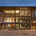 Horizontal plank sunscreens help to reduce solar heat gain and glare on the adjacent floor-to-ceiling glass storefronts. Made of terracotta, they echo the color and materiality of the sloped clay tile roofs prevalent elsewhere on campus.