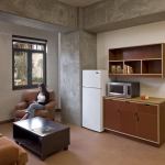 For an extremely well-insulated building shell, architect Steven Ehrlich chose to construct the residence halls with Thermomass precast concrete panels, which consist of two layers of 3- and 5-inch-thick concrete thermally separated by 3 inches of foam insulation. The assembly provides thermal mass to help regulate the building’s heat gain and loss by absorbing heat from interiors during the day and slowly releasing it at night. He left them fully exposed on the interior as well as the exterior for extra durability inside the suites.