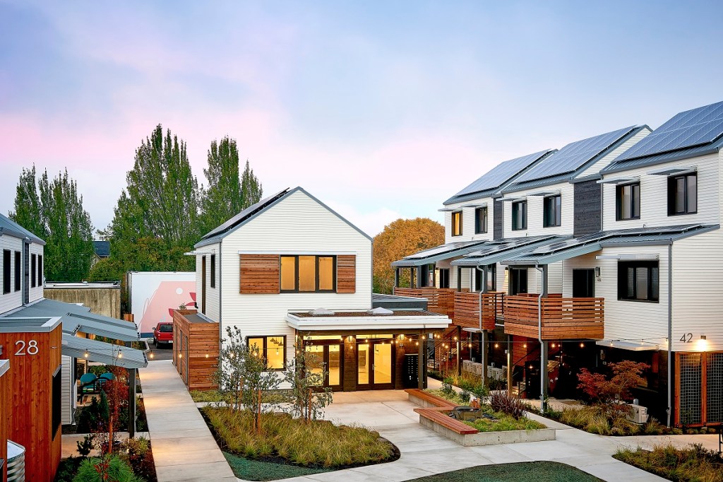 The 16-unit community achieves net-zero energy through a combination of energy-efficient building practices and an 82-kilowatt rooftop solar array.