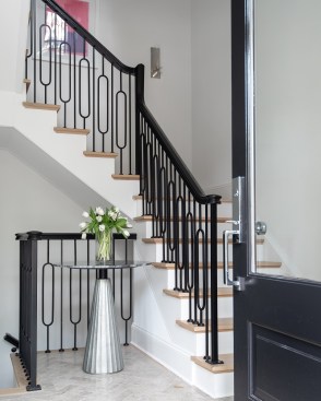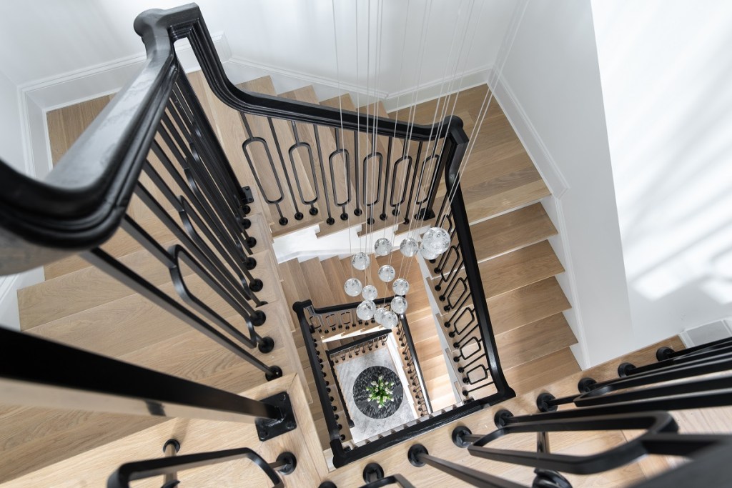 Evelyn Pierce Smith, founder of Evelyn Pierce Design Studio, consulted with Teass Warren on the project. “Aiming for a modern twist on the French townhome, the geometries of the metal balusters with the glossy wood handrail are meant to tie together the contemporary and traditional details of the home,” she says.