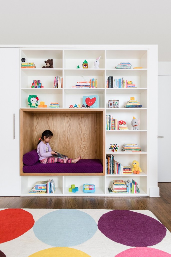 In the childrens’ bedrooms, the team designed the spaces with lots of storage for easy access to toys and books to encourage imaginative play. A small white oak nook, built within a floor-to-ceiling bookshelf, breaks the symmetry of the white cubbies and gives the children a unique space to read, craft, or play. Plush-quilted cushions fabricated specifically for the alcove from Dutch textile maker Febrik offer a comfortable oasis for afternoon naps, too.