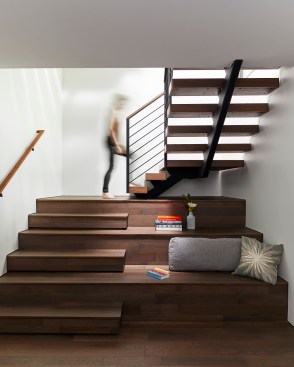 In the home’s basement, a wood platform stair connects the lower level with the main living on the first floor. Due to its location near the garage and mudroom, the wider steps to the right of the staircase provide a convenient place to sit for both children and adults to put on—or take off—wet boots and shoes.