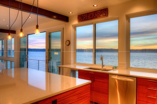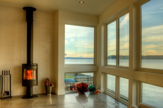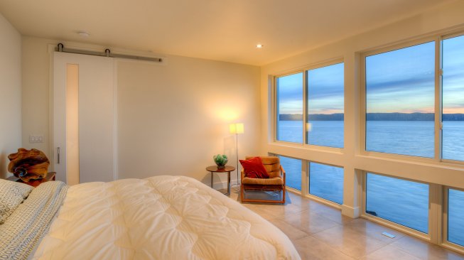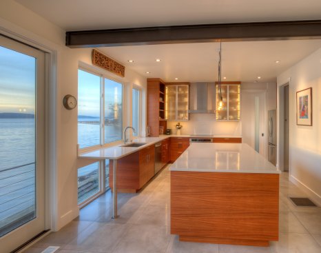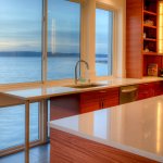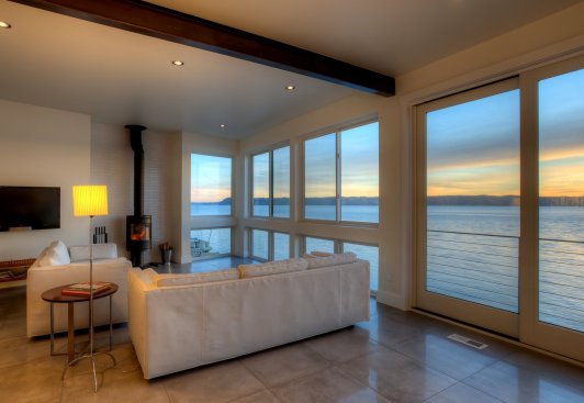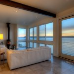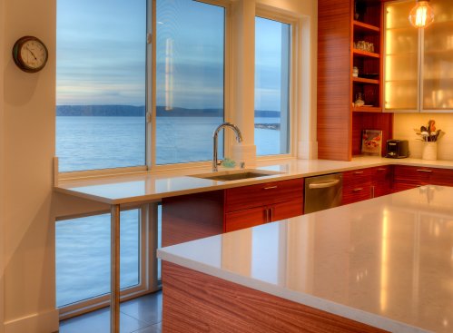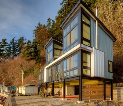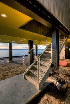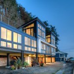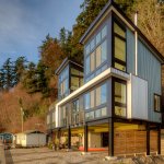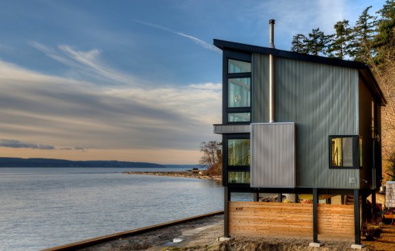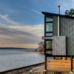 Located on the west side of picturesque Camano Island in Puget Sound, the Saratoga Hill house was designed for an empty nester couple who wanted to downsize to a smaller, low-maintenance home on the water after living for years in a large house in the Seattle suburbs. As a boy, the husband and his family spent summers in a cabin on the property and he wanted a modern, new house to continue the tradition for his children and grandchildren.
