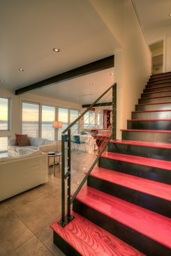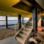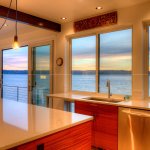 In addition, the project team took great pains to make sure the house would stand strong against a range of environmental threats including mudslides, flooding, and wind-driven rain. Located on a steeply sloping site, the home is perched on 13 14-inch-wide, 9-foot-high steel columns to keep it out of the way of water and mudslides. Durable metal siding and roofing will stand up to Mother Nature’s wrath, and where the elements might get in, such as the home’s abundant Andersen windows, workers carefully installed a water-resistant membrane.