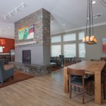 Given the Villas’ location across the street from a major shopping complex, the developer won a 25% increase in allowable density in exchange for specifying higher-quality exterior materials, plumbing fixtures, and appliances. The 240 units, with their Northwest styling and jaunty gables, are clad in vibrant colors of fiber-cement siding that break down the buildings’ scale. Taut metal balconies face green spaces.