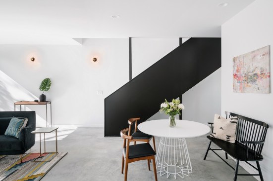 Inside, clean lines, white finishes, and black accents provide a modern feel. All four buildings use a common palette of materials, but display their own unique differences in layout and use. Some unit highlights include white quartz waterfall counters, polished concrete ground floors, oak hardwood flooring, large black-framed windows, and contemporary lighting fixtures.