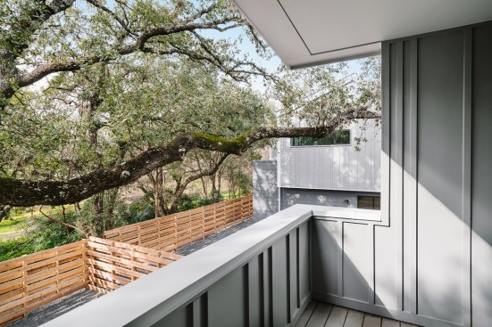 To make each unit feel like a treehouse, Odom and his team brought the leafy scenery inside by utilizing large window openings and glass doors that capture ample views of the tree canopies. Large, covered balconies off the master bedrooms and second-floor living spaces also give homeowners the opportunity to feel they are living among the trees.