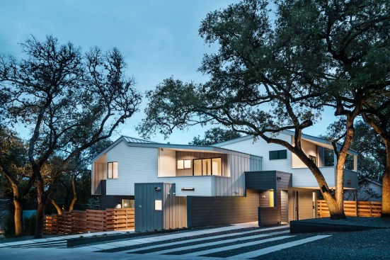 On a heavily wooded property in Austin, Texas, local architecture firm Mark Odom Studio, along with developer Little City Development and builder Acero Construction, subdivided a 1-acre single-family home site into four lots, each with a two-story duplex.