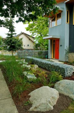 A gabion basket rock wall provides privacy in the busy urban nei…