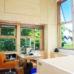 The high-performance building shell includes exposed concrete exteriors and a second wood frame wall on the interior, creating a double wall that holds 14 inches of open-cell foam insulation. The walls on the second floor are built from 2×10 plates and staggered 2×4 studs. Standing-seam siding creates a durable exterior cladding system that contrasts with colorful fiber cement panels that align with the vertical window patterns, Tuer says.