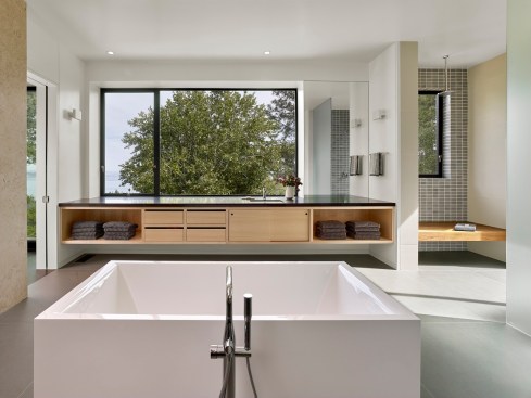 Thanks to the site’s sloping lot and densely clustered trees that ensure privacy, the design team was able to incorporate floor-to-ceiling windows in the shower and water closet areas to further open the space to the outdoors.