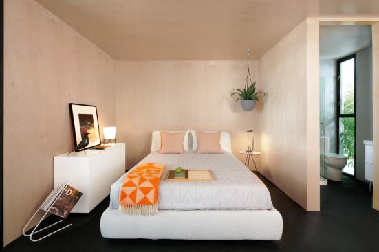 Each comes furnished with the minimal essentials, including built-in surfaces and fixtures, and is completely recyclable at the end of its use. Plús Hús units are locally made at mnmMOD’s sustainable fabrication facility in downtown Los Angeles, and due to their flat-packed arrival to the site and fully modular building method, there is almost no waste produced throughout fabrication, shipping, and construction. The panels contain no dyes or formaldehyde, and do not release VOCs or other harmful toxins into the environment.