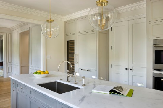 The marble-topped island boasts seating for three and an undermount sink with a silver chrome faucet. Above the area, the designers added two brass statement lighting fixtures with spherical glass shapes and 3-inch recessed lights. Existing red oak floors were refinished and lightly stained.