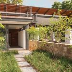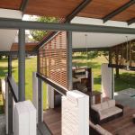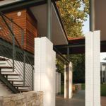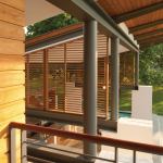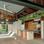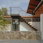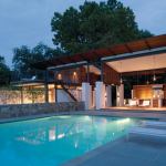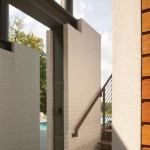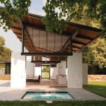 The pool was already there, so the architects used that as a starting point and designed around an existing stone wall. That wall now divides the structure’s open air spaces from its only conditioned private spaces—a bedroom and bathroom—which are otherwise enclosed in stucco masonry. The open air side, meanwhile, includes a breezy kitchen, an outdoor shower, and a pool equipment area, all topped by a thin copper roof that is supported by white brick piers. The projecting roof provides welcome shade, as do timber louvers offering additional sun control.