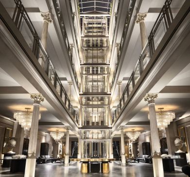 Upon entering RH New York, visitors are greeted with a skylit, six-story central atrium and glass elevator, which leads to each retail concept’s floor and ultimately the rooftop garden.