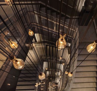 To reach the upper levels, visitors can also ascend a grand double staircase illuminated by art installation “New York Night” by Alison Berger. Composed of 120 hand-blown crystal teardrop pendants cascading 90 feet through the six-story staircase, the piece is designed to evoke “a downpour at nightfall, engaging the viewer in an ever-changing pattern of expansion and compression,” according to the release.