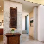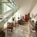 On one long side of the house is a courtyard with both a garden and a swimming pool (yes, it’s a long, skinny pool that’s perfect for laps). Olive trees grow at the front entrance. Floors are a combination of concrete and smooth-pebble aggregate that looks almost like a rug and massages your feet when you walk on it, says Abramson.