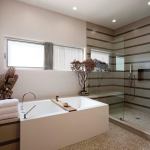 The bathroom floor uses the same pebble aggregate as in the living room. Floors have radiant heat.