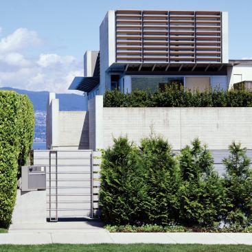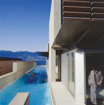 In architecture, inspiration waits for a problem. Look behind any truly innovative house and you’ll find the constraints that made conventional solutions impossible. In the case of this custom home on the shore of English Bay in Vancouver, B.C., the challenges began with fitting living quarters, a swimming pool, and a two-car garage onto a mere sliver of land. The 26-foot-wide buildable footprint led architect John Patkau to locate the pool at the second level. A code limit on square footage led him to make the area below the pool an outdoor walk to the entry door rather than an indoor circulation space. The need for daylight at the walkway led him to design the pool with a glass floor. All of which led to concrete.