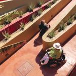 The two-story structure reuses some of the walls and foundation of an existing house that was in bad shape. Guest quarters are at ground level; main living and sleeping areas are stacked on top to take advantage of panoramic views—of the Sea of Cortez to the east and the Sierra de la Laguna Mountains to the west. The 165-foot-long outdoor ramp makes these upper spaces reachable by wheelchair. Interwoven with spiky agave in terraced planters, it sweeps up to a 10-foot-by-10-foot patio, then switchbacks up to a larger lookout before crossing a bridge to expansive terraces outside the house.