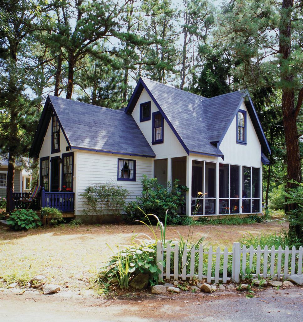 This summer cottage belongs to a co-op: It’s one of 70-some cottages that were once part of a 1880s Methodist family retreat on Cape Cod. In the typical tradition of these family camps, this small cottage, like the others around it, was designed for summer use only and was built around a Tabernacle, a large structure used for worship and community meetings, as well as near the railroad for easy access from the city (in this case, Boston). The Tabernacle is long gone, but the community spirit of the place lives on. So does the Gothic Revival flavor of this cottage, thanks to a thoughtful addition that paid close attention to the scale of the existing forms, the pitch of the roof, and the size of the windows.