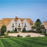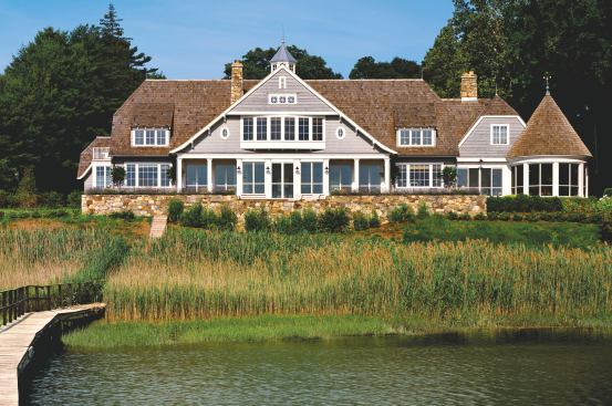 The concept behind the house’s form and detailing came from the idea of a “grand beach cottage,” as project architect Mark Goodwin says. The historic boathouses on Lake Muskoka, Ontario, one of Beinfield’s favorite spots, served as a second source of design inspiration. And the late-1800s housing stock in Darien, Conn., also influenced the building’s character. But make no mistake about it: This is a house with its own, original design DNA. To start with, nearly every bit of it—from the sweeping roofs to the 7½-by-4-foot front door—is slightly oversized, again playing down the home’s bulk. “Making the pieces larger brings the scale down,” says Goodwin. “The triple gable comes from the English architect Edwin Lutyens—it breaks up the house’s length, and having the two side gables brings the roof edge down to a more human level.” Thick, wavy cedar skirl siding with a 10½-inch exposure and medium handsplit cedar roof shingles contribute to the overall goal of making the house appear smaller, while their natural irregularities impart a handmade quality.