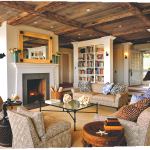 The careful balance of sophistication and rusticity continues inside. Susan Harris co-owns and designs fabrics for SeaCloth, a boutique textile company. She asked for an interior palette of colors and materials that would showcase her creations. Beinfield and Goodwin concocted an open floor plan in which rooms are separated by pillars and wall segments, rather than hallways and full walls. Custom copper sconces, designed by Beinfield and made from readily available plumbing parts, provide an elegantly simple lighting solution. The central living room sits three steps down from an informal entry zone, dining area, and music room, allowing easy sight lines across the public spaces and out toward the water. “The change in level allows you to feel a sense of where you are in the house,” says Goodwin.