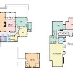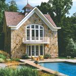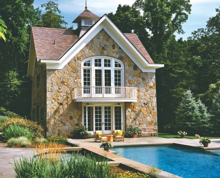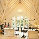 The studio’s exposed, white-painted rafters provide a serene, loft-like environment. Homasote panels, perfect for pinning up sketches, line the walls. Color-corrected artists’ lamps ensure an even distribution of task lighting. While Chuck Harris’ office matches the main house in its materials and style, the pool house/studio follows a slightly different path with its purple-toned slate roof and cut granite walls.