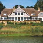 Luckily for the sound, Susan and Chuck Harris’ waterfront home doesn’t. Architect Bruce Beinfield placed it on the same spot as the old house on the site, a 1950s teardown, so they didn’t have to cut down any trees. He gave the entry façade three pronounced gables and roof pitches as steep as 16 in 12, which help minimize the 7,500-square-foot project’s scale. A garage wing and a separate building for Chuck Harris’ home office, both perpendicular to the main house, create a protected entry court. On the rear, south-facing side, deep gambrel roofs and sensitive landscaping display a becoming restraint.