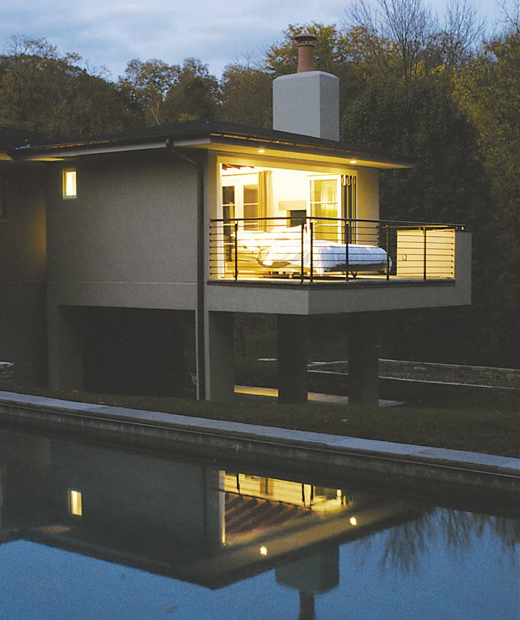 Sleeping under the stars in the comfort of a well-appointed bed is no longer just a fantasy for an Indian Hills, Ohio, homeowner thanks to the ingenuity of Cincinnati-based John Senhauser Architects. “The client originally asked for a retractable roof,” says designer Jane Keller, “but budget and space didn’t really allow, so we came up with another solution.” Instead of a movable roof, the architect devised a movable bed. She added 221 square feet to the existing upstairs master bedroom, extending the suite over a now-covered terrace and creating a balcony. On evenings with clear skies and warm breezes, a gentle push sends the owner’s bed gliding onto the balcony along a curved heavy-duty library rail and track system inlaid in the maple floor. When the bed rounds the curve and hits the accordion window-wall, Keller’s strategy gets even cooler. “The track had to stop at the door to maintain water-tightnesss,” she explains, “so the bed has two layers of steel frames—the top frame is like a drawer sliding open onto the balcony and revealing a cherry tabletop that acts as a nightstand while covering the bottom frame, which anchors the bed in place.”