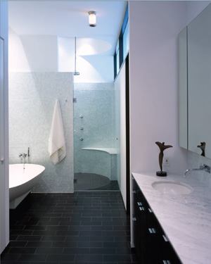 This historic three-story building in downtown Austin, Texas, made an intriguing prospect for a single-family residential conversion, but it came with some daunting constraints. Twenty-one feet wide across its front elevation, the building stretches 125 feet from sidewalk to back alley. Architect Tim Cuppett didn’t mind, however. “Rather than fight that,” he says, “I chose to emphasize it.” The approach is most evident in the third-floor master bath/dressing room, which goes to great lengths in delivering a transcendent experience.