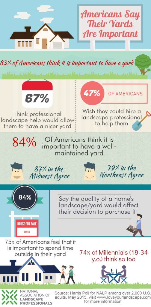 NALP’s infographic below showcases more of the surveys findings, including how important Americans find yard maintenance to be (for them and their neighbors) and their likelihood to see professional landscape help.