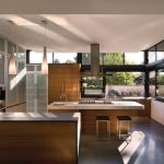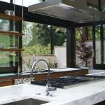 This serene home sits on the line where the Great Plains and the city of Boulder converge with the foothills of the Rockies. The clients, both avid rock climbers, wanted “a place to come home where they could close the door on the city side of the house and open up the mountain side to the west,” explains architect E.J. Meade. The kitchen, being the spot where life continues after the work day is done, is one of many realms designed to facilitate just that sort of unwinding. Scaled to accommodate both intimate dinners and large parties, it anchors an expansive living/entertainment area with views of the western sunset over the Flatirons. Integrated appliances and simple cabinet faces ensure that the space does not detract from the splendor of what’s outside. At the same time, the design brings the colors and textures of the landscape in with a blend of limestone walls, marble and honed Italian quartzite countertops, rift-sawn walnut casework, and brushed aluminum cabinet faces with etched glass inserts. Of course, any home intended to commune with nature would not be complete without an al fresco component. The entire space spills easily onto an outdoor patio (one of its glass walls even slides away to create a pass-through to an outdoor seating bar), at which point the smooth Pennsylvania bluestone under foot takes on a slightly rougher flamed finish to prevent slipping, explains builder Richard Sands. It’s a subtle transition and just one of many impeccable details that make this home a big winner.