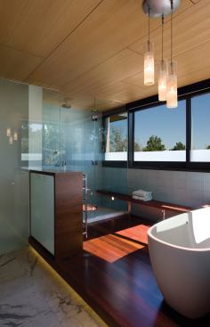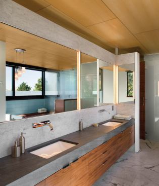 This master bath is a beauty in its own right, but it’s also “of a piece” in that it incorporates many of the same materials that are used elsewhere both inside and outside of this serene house at the base of the Rockies. In this light-filled retreat, jarrah wood (which is also used as exterior cladding and decking) takes the form of vanity cabinets and a custom bench, as well as flooring around a freestanding tub. “In Australia, this wood is used for everything from boat docks to warehouse pallets,” explains architect E.J. Meade. ”It’s rapidly renewable and very dense. Like ipe, it has a high oil content, so getting a penetrating sealer requires that you wipe it with solvent first.” Other subdued materials, including soapstone, marble, and glass tile, evoke the colors and textures of the natural landscape, as seen through a ribbon of steel frame windows.