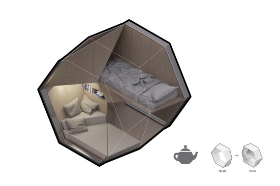 A standard Homed pod will begin with a steel hollow structural section covered with a 3D-printed, recycled polycarbonate shell. The exterior of the unit is then fitted with a pre-fabricated steel and oxidized aluminum façade, while its interior is clad with wood laminate. Each module will offer customization options for appliances, furniture, storage space, and utilities. Attaching pods together, as another option, would expand the interior space and add other functions such as a shower, an extra bed, a reading nook, or communal space. “The unit is designed to provide year-round housing that can withstand harsh, cold weather and provide a cool space during summer,” according to a release.
