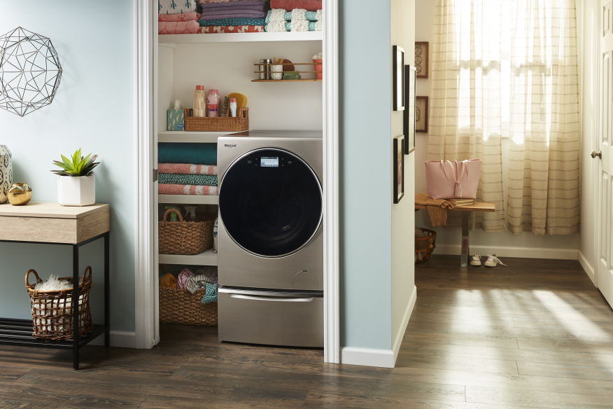 - The Whirlpool Smart All-In-One Care Washer and Dryer, pictured right, which offers laundry cycle notifications through the Whirlpool smartphone app and compatibility with Amazon Alexa,