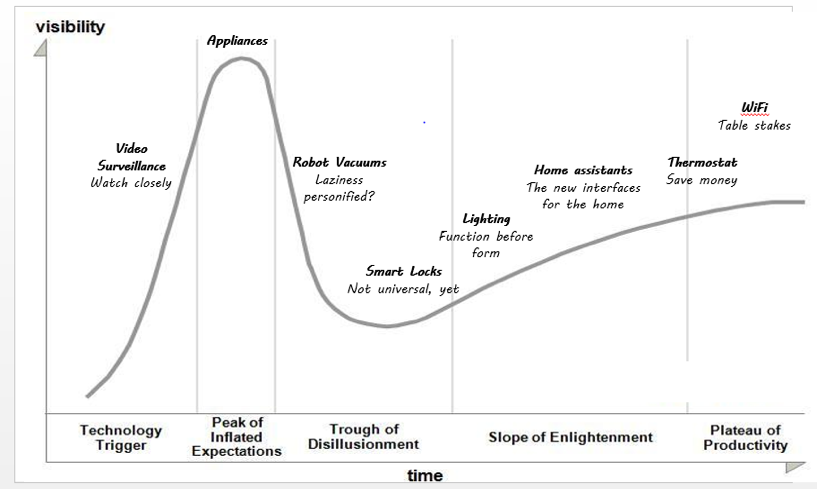But, two years is an eternity in the technology space, and we wanted to explore what a smart home hype curve may look like from a home builder’s perspective. With all due respect for Gartner’s expertise, here’s how we might update the Hype Cycle for today’s home builder: