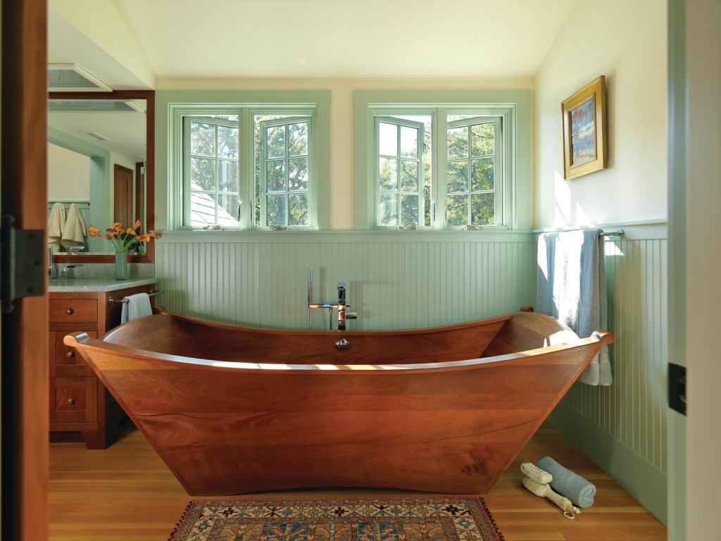 The Arts and Crafts–inspired residence Folly Cove overlooks the shore in Gloucester, Mass., and the custom tub in its master bath looks as if it might have arrived under sail. Designed by Steve Batiste of Bath in Wood of Maine, its form is a composition of stems, sheer lines, gunwales, and transoms. Of course, Batiste says, “I was building a 33-foot dory at the time, so that helped.”